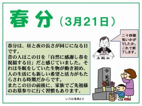 【校長室の独り言:特別講義最終号】 3連休はいかがお過ごしですか。昨日はちょっと北風が強くて体感温度は低かったように思います。東北・北海道等では荒れた天候で停電などの被害も出ていました。 さて、4月の「清明」から始まった特別講義「二十四節気」も今日が最終の[春分]となります。二十四節気をとおして、季節というもの見ていく視点もあるという紹介でした。ぜひ今度は、1か月1度の朝会で子どもたちにも話していきたいと思います。季節を体感、また理解するのも教育の一環と考えています。3連休ですが、校内で仕事を進める職員の姿が見られます。事務処理は学校で行わなくてはならないものも多く、普段常に子どもと向き合っている教職員には勤務時間外の仕事も多くなります。年度末・年度初めは特に「忙中閑あり」でなく「忙中忙あり」ですね(*_*)