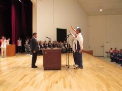 翌12(日)には、全国育樹祭が山形県金山町で開催され、皇太子殿下ご臨席の下、県内外から約5000人の参加者がありました。開会の前に、西川公也農林水産大臣から、本校児童2名に対して励ましのお言葉をいただきました。あいさつ・おことばの後、表彰があり、全国育樹祭大会会長・参議院議長山崎正昭様から、緑の少年団活動発表大会入賞賞状をいただき、西川公也大臣からはみどりの贈呈「無花粉杉」をいただきました。