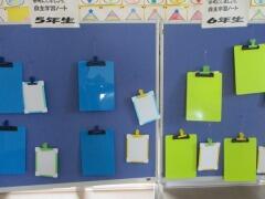 本校は栃木県学力向上プロジェクトの推進校となっています。学力向上アドバイザーからのアドバイスの一つに、「自主学習ノートの公開」があります。3階廊下に、よくまとまっているノートのコピーを紹介するコーナーを作りました。