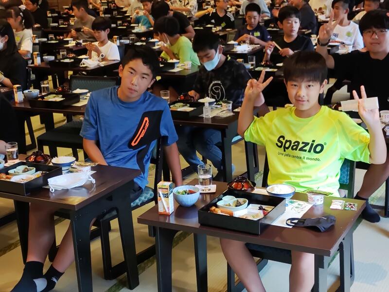 今日の宿泊場所である栄楽館に着き、夕食をいただいています。ホテルの方に到着のあいさつもできました。おかわりをして、たくさん食べていました。