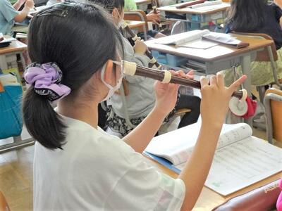 【5年生】5時間目に、また「ふるさとの森」の方から、素敵なリコーダーの音が聞こえてきました。「茶色の小びん」という曲です。主旋律と低音パートに分かれて練習をしたあと、みんなで合わせていました。「ふるさとの森」が歌っているような感じがしました。