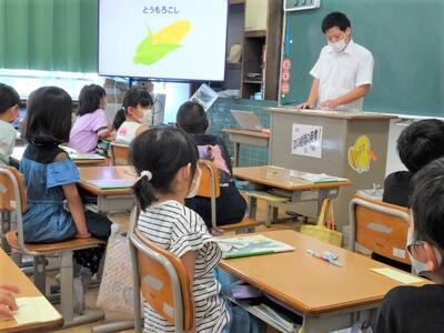 【2年生】1枚目の写真は、国語の時間に「あったらいいな こんなもの」の発表会をしている様子です。自分が考えた、あったらいいものを画像を見せながら詳しく説明して行きます。説明を聞いていると、確かにあったらいいものです。