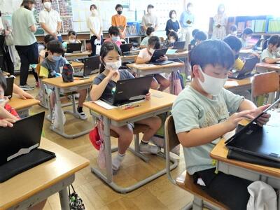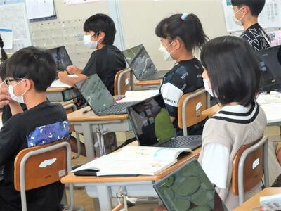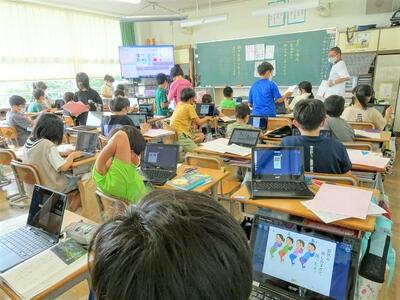 【5年生】1枚目の写真は、理科の時間に、自分たちが自由研究で調べてきたものを、ロイロノートで読み合っている時間の写真です。ちょうど、友だちへの質問タイムの時でした。それまで、画面に向かって友だちの研究を読んでいた子どもたちが、知りたいことについて聞きあっていました。