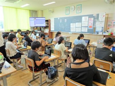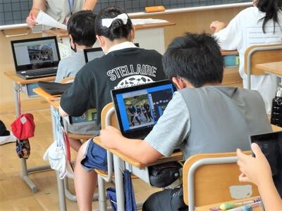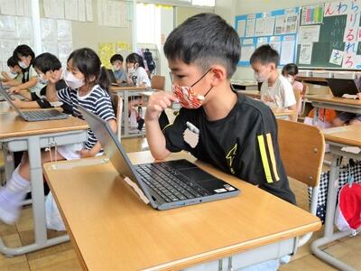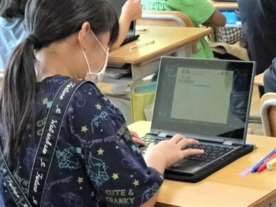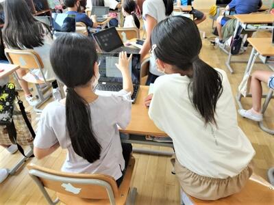 【5年生】1枚目の写真は、理科の時間に「自由研究(学校で調べていたもの)」のまとめをしている場面です。7~9枚のシートを、一つのシートにまとめていきます。子どもたちのパソコンのスキルは、上がる一方です。