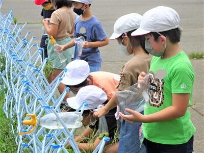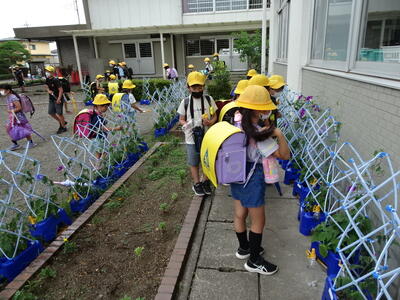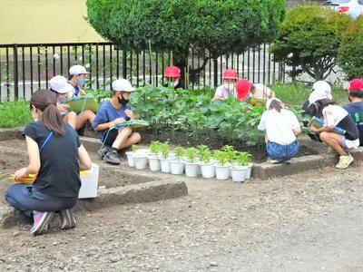【2年生】生活科で育てている野菜の観察です。ミニトマトなどは生長が早く、もう収穫して持ち帰っています。トウガラシも赤く熟していました。まだ収穫をしていない野菜も、もうすぐに収穫できそうです。