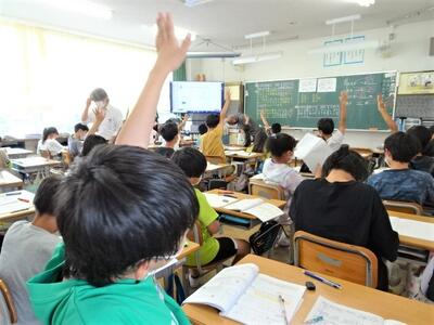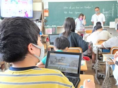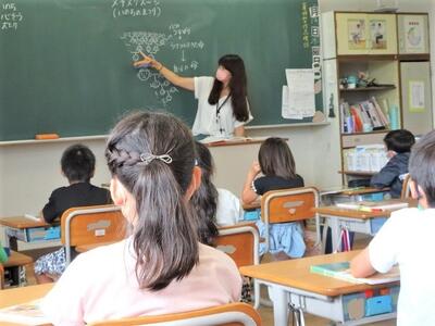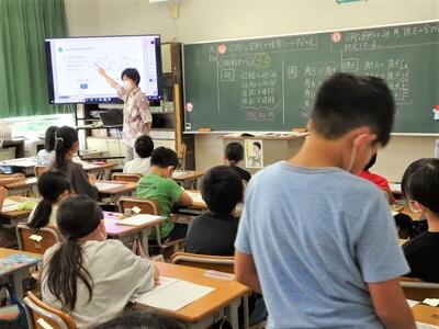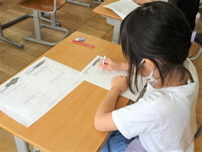 【5年生】1枚目の写真は、「米づくりがさかんな地域」の学習をしている様子です。米作りのさかんな地域や、米の生産量の少ない地域について、棚田等の地形的な条件が影響をしていることを考えることができました。