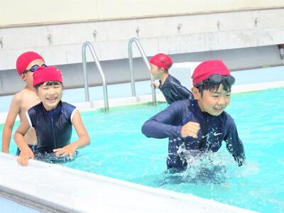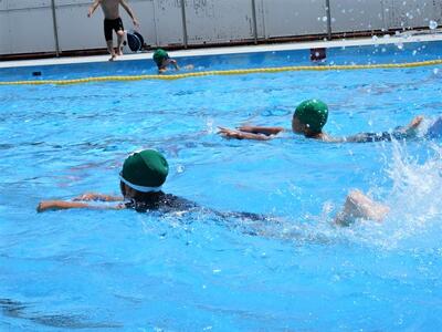 【2年生】1枚目と2枚目の写真は、2年生の体育の時間の様子です。「水に慣れる遊び 浮く・もぐる遊び」という単元の学習で、いろいろな遊びを通して水に慣れたり、楽しく遊んだりすることを目的にしています。今年は、天候にも恵まれ、順調にプール活動が実施できています。