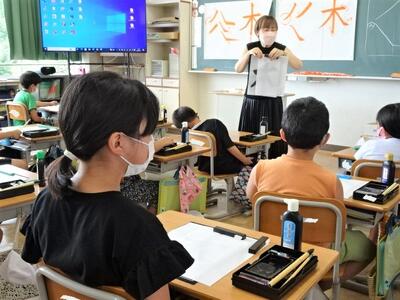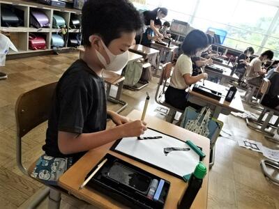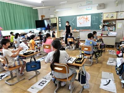 【3年生】今日は、外部指導者(専門家)による書写指導がありました。1枚目と2枚目の写真がその様子です。今日のねらいは「はらい」の部分を書けるようにすることです。子どもたちも真剣に取り組み「はらい」の書き方に慣れ親しむことができました。