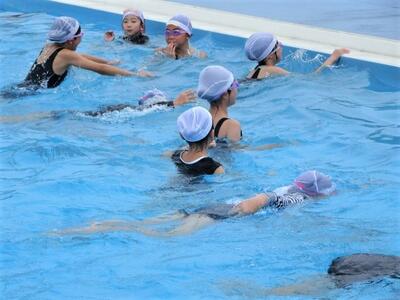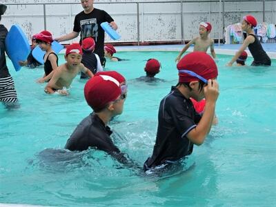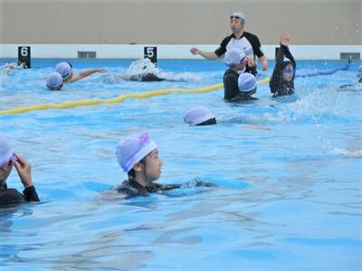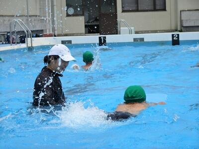 【5年生】1枚目の写真は、「水泳」の時間の写真です。5年生では、クロールや平泳ぎの技能を身につけて、続けて長く泳ぐことを目標にしています。写真は、クロールのキックの練習の様子です。二人一組で、一人が組になった友だちのキックを確認して、お互いに助言し合っていました。