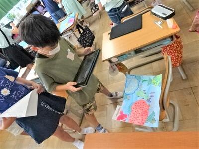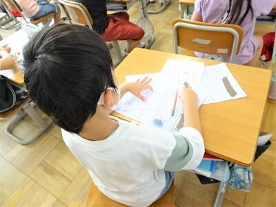 【5年生】1枚目の写真は、図画工作「糸のこスイスイ」で作製した作品の鑑賞をしている様子です。友だちの作品を見ながら、良かったところや工夫されているところをワークシートに書き込んでいます。ホワイトボードなので、実用的ですね。