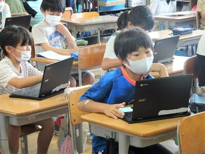 【1年生】1年生も、かなりパソコンのスキルが高くなってきています。1枚目の写真は、国語の音読を録画して、先生の提出箱に入れている場面で、2枚目の写真は、音楽の時間に楽曲の動画を鑑賞している様子です。日々、いろいろなことができるようになっていてすごいです。