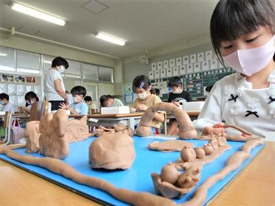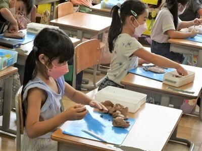 【3年生】1枚目の写真は、図画工作の「ねん土 マイタウン」の活動です。題名のとおり、粘土板の上に自分が考えた街が作られていきます。一人一人がいろいろな工夫をしていて、素晴らしい作品ができました。