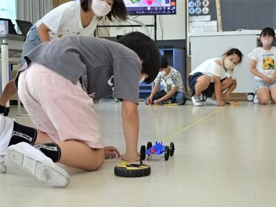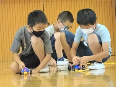【3年生】1枚目の写真は、理科「風やゴムのはたらき」という単元の学習を行っているところです。実験用のキットを使い、遠くまで走らせるのはどうすればよいかを実験しています。ゴムの本数を増やしたり、巻き数を調整したりして、実験を繰り返していました。