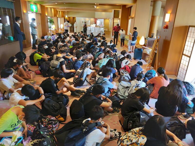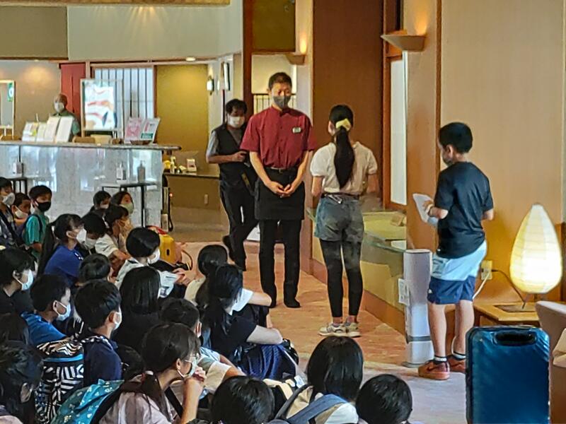 今日の宿泊場所である栄楽館に着き、夕食をいただいています。ホテルの方に到着のあいさつもできました。おかわりをして、たくさん食べていました。