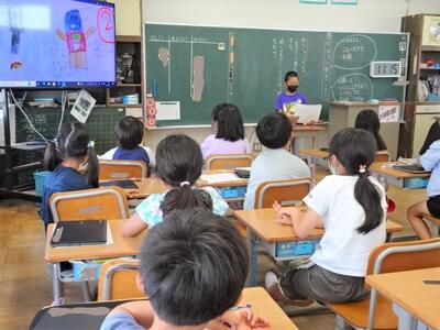 【2年生】1枚目の写真は、国語の「あったらいいな」の発表の場面です。大型提示装置に映されたイラストを見ながら、いろいろな質問をしていました。みんな工夫がいっぱいです。