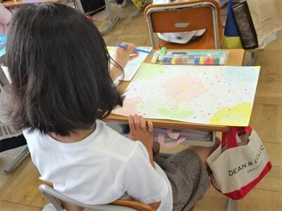 【2年生】1枚目と2枚目の写真は、図工の時間にカラフルなうちわを作っている様子です。1枚目は、デザインの下書きをしているところで、2枚目は下絵をもとにセロファンを貼りだした場面です。色を重ねながら、工夫をしています。