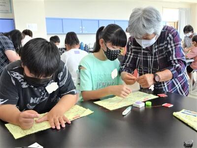 【5年生】今日の午前中、各クラス2時間ずつをかけて、お裁縫に挑戦しました。「ひと針に心をこめて」という単元で、玉どめや玉結びなどを行います。子どもたちにとってはとても難しい作業です。11名の裁縫ボランティアの方々が、各グループに分かれて、コツを教えてくださいました。