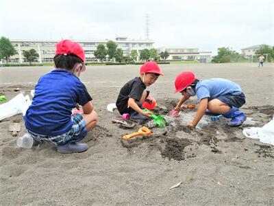 【1年生】1枚目の写真は、図画工作の「すなやつちとなかよし」という題材の学習です。校庭にある砂場で、砂をほったり、山を作ったりしながら、グループで考えた形を作っているところです。水をくんできては流しながら、夢中になって造形作りに挑戦していました。