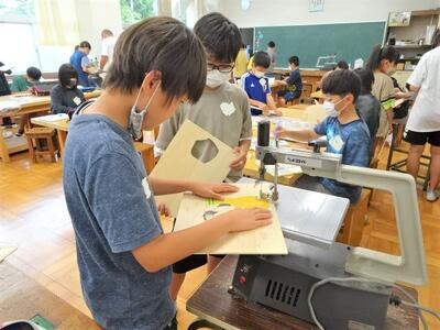 【5年生】1枚目の写真は、図画工作の「糸のこスイスイ」という題材の学習です。電動糸のこを使って、自分がデザインした形に切りとり、お家で使える掲示板を作成しています。初めての糸のこですが、使い方をしっかりとマスターして安全に使っていました。