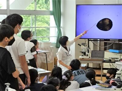 【6年生】1枚目の写真は、理科の時間に微生物の観察の学習をしている様子です。写真は、顕微鏡を実際に見る前に、電子顕微鏡を使って大型提示装置に映像を映し、見え方について確認をしている場面です。普段見えないものですから、子どもたちも興味津々です。