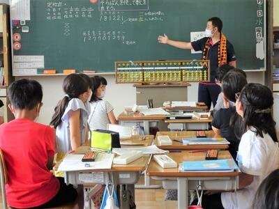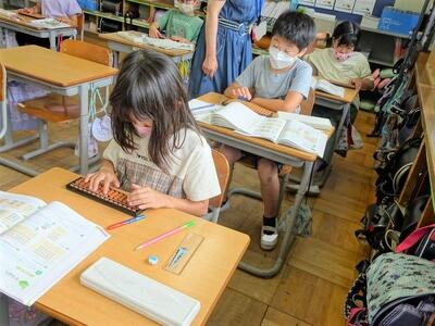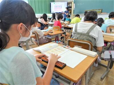 【4年生】1枚目から3枚目の写真は、算数の時間に「そろばん」の学習をしている様子です。3年生の時から始まったそろばんですが、今回は、数字が大きくなったり、小数点が付いたりします。久しぶりにさわったそろばんに夢中でした。