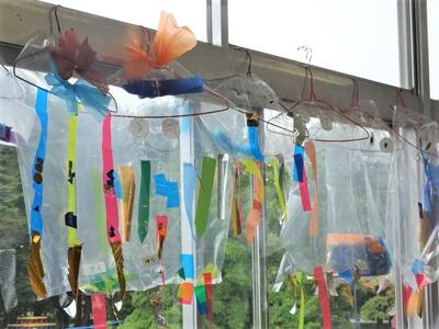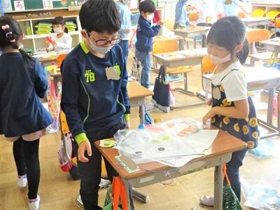 今日は1年生の図画工作「チョキチョキかざり」の活動です。はさみの扱いに慣れたり、思い思いの形に切り取ったりすることを目的としています。切った飾りは、ビニールに貼りハンガーでつるして、素敵な教室の飾りになりました。