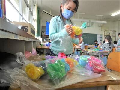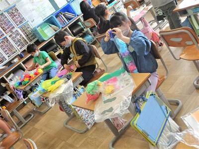 今日は、3年生の図画工作「カラフルフレンド」です。この単元では、いろいろな色の紙や形の組み合わせを工夫して、楽しい友だちを作る内容です。カラフルな色紙をビニールの中に入れ、バランスをとりながら形作っていきます。子どもたちの愛情たっぷりの人形の友だちがでいあがりました。