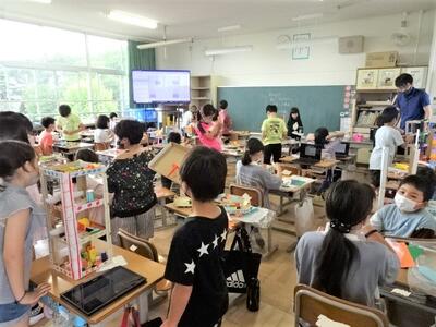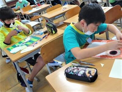 今日は、6年生の図画工作「くるくるクランク」の活動です。これは、クランクの仕組みを作り、動きを生かしながら思い思いに動きのある作品を作っていくものです。海を想像しながらイルカが跳びはねていたり、バスケットボールをしている様子を表したりと、一人一人がいろいろな工夫をし、素敵な作品に仕上げていました。