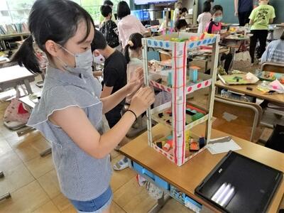 今日は、4年生の図画工作「コロコロガーレ」です。ビー玉を転がすコースを作っていく内容です。子どもたちが作るのは3階建てのコースで、ビー玉を転がしながら道を作ったり、いろいろな障害物を置いてみたりと、たくさんの工夫をしていました。作り終わった後は、友だちと交換し合いながら、ビー玉を転がして遊ぶこともできました。