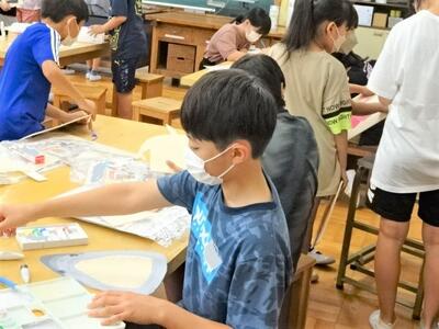 今日は、5年生の図画工作「のぞいてみると」の学習です。これは、穴を開けた段ボールに差し込む光の様子から表したいことを見つけ、形や色などを工夫して表す内容です。子どもたちは、穴をのぞきながら、作業を進めていきます。真剣に取り組む子どもたちの姿が印象的です。