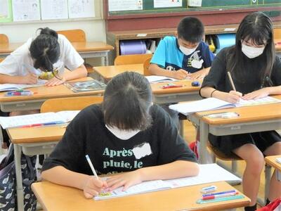 長い夏休みが終わり、第1学期の後半が始まりました。久しぶりの登校で、荷物をたくさん持っているためか、朝の挨拶の声は小さめでしたが、帰りの時にはいつもの明るく元気な子どもたちに戻っていました。今日は、夏休み明けで夏休みの出来事の発表や、復習のテストなどを行っているクラスが多かったのですが、子どもたちはとても落ち着いて学習に向かっていました。