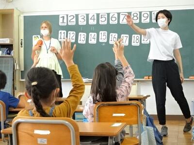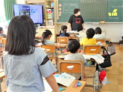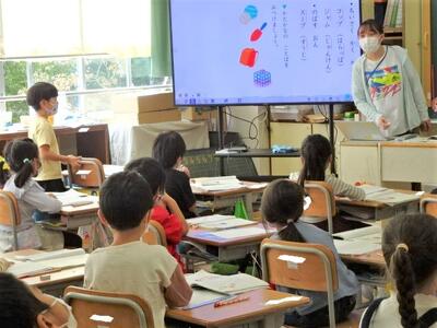 【1年生】1枚目の写真は、外国語活動の時間の写真です。黒板に掲示されているように、数を英語で数える学習です。マトリョーシカが何個あるか予想して、英語で数えながら確認をしていました。ゲーム感覚で、自然と英語を使う流れが楽しく学べる秘訣です。
