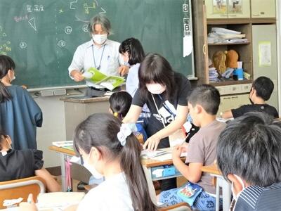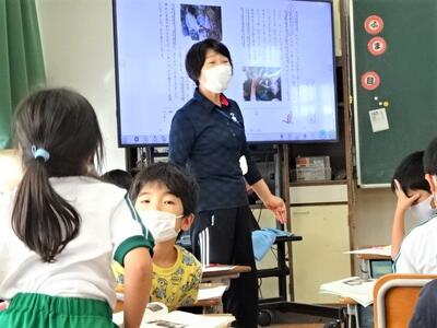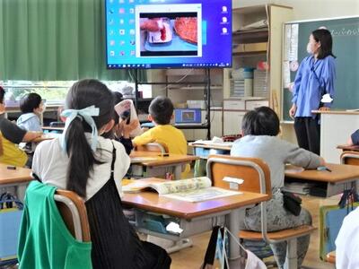 【1年生】1枚目と2枚目の写真は、国語の時間の様子です。「うみのかくれんぼ」の学習が終わり、今度は自分たちが図鑑や読み物などから他の生き物の隠れ方を調べていくのです。これまでの国語の学習の成果を活かして、何がどこに、どのようにして隠れるか、観点を絞って調べていました。