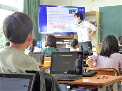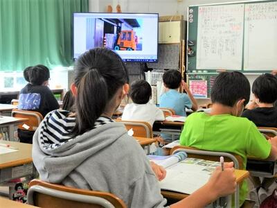 【3年生】1枚目の写真は、社会科のスーパーマーケットの学習の続きです。スーパーマーケットの秘密に迫るために、予想したことが本当に行われているか、映像を使って確認をしていきます。子どもたちは、普段見られないバックヤードに興味津々でした。