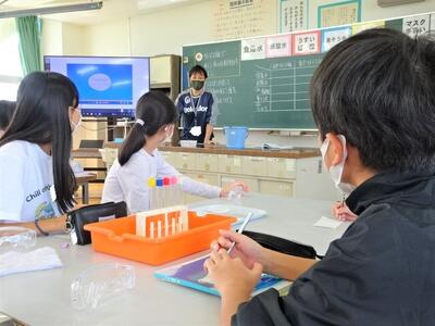 【6年生】1枚目の写真は、理科の「水よう液の性質」の学習の様子です。今日は、リトマス紙を使って、アルカリ性なのか酸性なのか、中性なのかを調べました。色がはっきりと変わるので、しっかりと分けることができました。