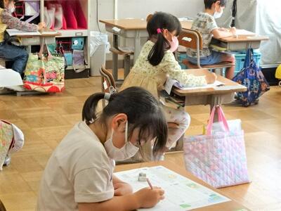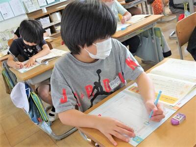 【1年生】まもなく入学して半年が過ぎようとしています。すっかり小学校の生活に慣れた子どもたち、まとめの時期である1学期末にテストに打ち込む姿も、とても様になっています。真剣な表情がとても素敵です。