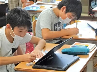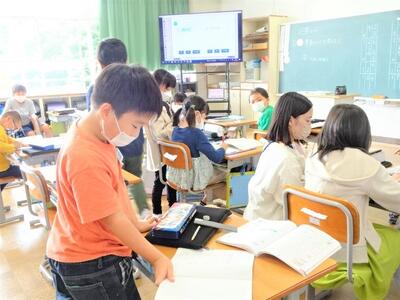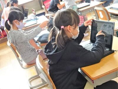 【5年生】1枚目の写真は、音楽の時間の一コマです。タブレットPCを使っている様子が分かります。今回の使うワークシートがタブレットに送付されているのです。データであれば、提出した後にみんなで共有することもできますね。授業の様子がどんどん変化している感じがします。