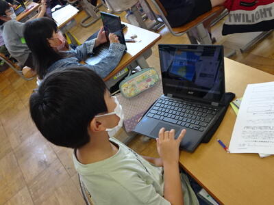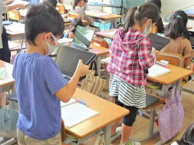 【1年生】1年生のパソコン操作の技術はどんどん高くなります。1枚目の写真は、図工の作品を写真に撮って提出箱に提出している様子です。この後、一人一人から送られた写真を見ながら、全員で作品鑑賞会を行いました。2枚目の写真は、アンケートを行っている様子です。