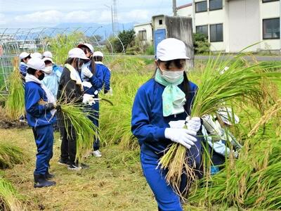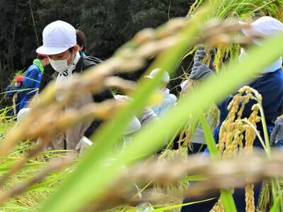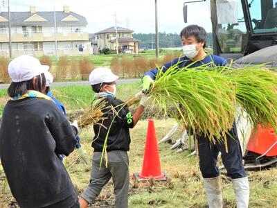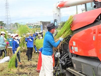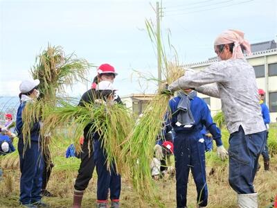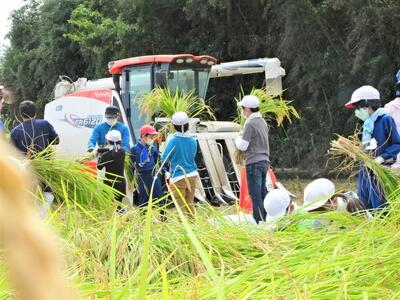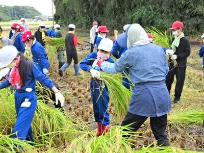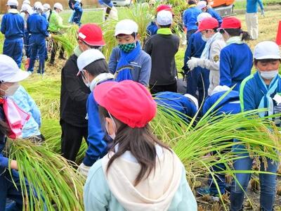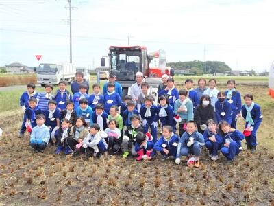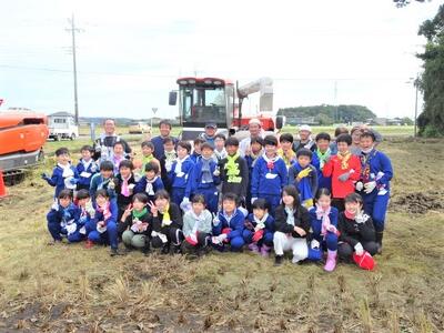 5年生が「総合的な学習の時間」で学習を進めている「米作りに挑戦しよう」の体験活動として「稲刈り」に挑戦しました。今日は、5名のボランティアの方々に協力をいただきました。大きなコンバインも稼働していただき、以前社会科で学習した稲作についての学習にもつながりました。終わってからの集合写真の子どもたちの表情が、達成感を表しています。ボランティアの皆様、本当にお世話になりありがとうございました。