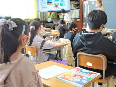 【3年生】1枚目と2枚目の写真は、外国語活動の一場面です。今日は、アルファベットの文字を知ることが目標です。子どもたちは、挿絵の中からアルファベットを見つけるアクティビティを行いました。答え合わせをしながら、文字の形一つ一つを確認していきました。