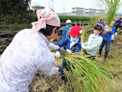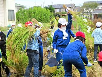 【5年生】1枚目と2枚目の写真は、総合的な学習の時間で「稲刈り」を行っている様子です。5年生の「田植え」や「稲刈り」は、本校の特色行事です。今日は、5名のボランティアの方々に教わりながら、鎌を使って「稲刈り」をしっかり行っていました。