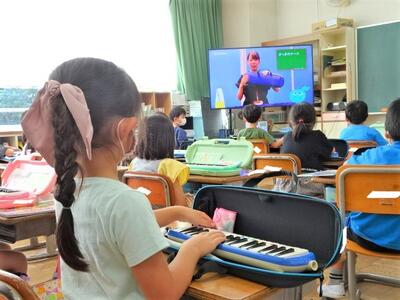 【1年生】1枚目の写真は、音楽の時間に一コマです。大型提示装置に映し出された映像を見ながら、鍵盤ハーモニカの使い方や片付け方を確認しています。いよいよ鍵盤ハーモニカを使い始めるようです。ピカピカの鍵盤ハーモニカに、子どもたちも興奮気味です。