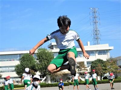 【4年生】1枚目の写真は、体育の時間の一コマです。ティーボールのゲームに入る前に、飛びなわを使ってペアになってとぶ運動をしています。調整力やバランス力をつけると同時に、運動量も確保できる運動ですね。この後は、ティーボールに親しんでいました。