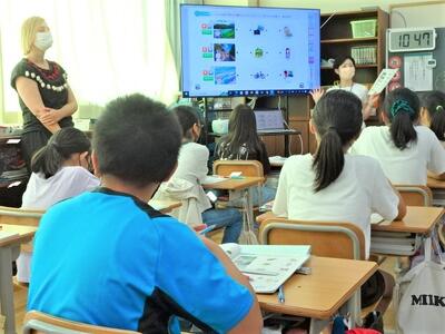 【2年生】1枚目と2枚目の写真は、外国語活動の一場面です。今日は、動物を英語で言う学習でした。黒板や大型提示装置、タブレットPCに示された動物を英語で言っていきます。好きな動物を英語で言えるようになった後には、動物のビンゴゲームをしました。