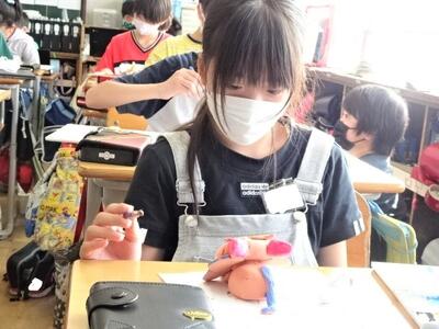 【4年生】1枚目の写真は、図画工作の時間の様子です。「立ち上がれ!ねん土」という単元です。板状やひも状にした粘土を立ち上げていき、表したい形にしていく内容です。写真では、人形の形を何体もつくり、それを立ち上げています。子どもたちは、基本の形をいろいろ工夫して、様々な形を作っていました。