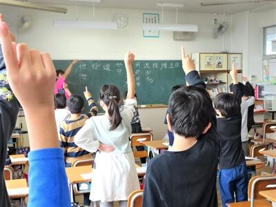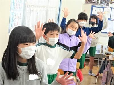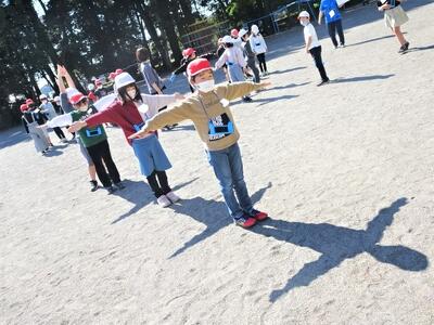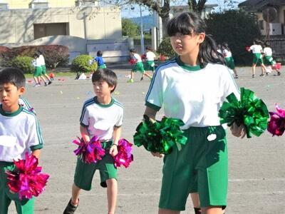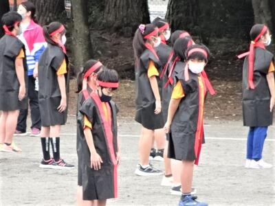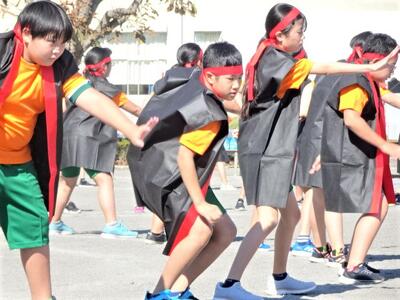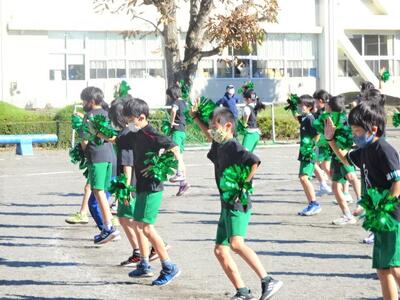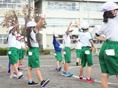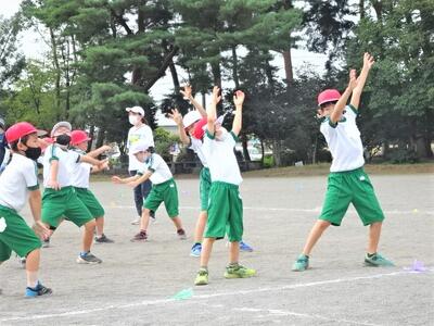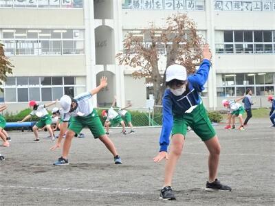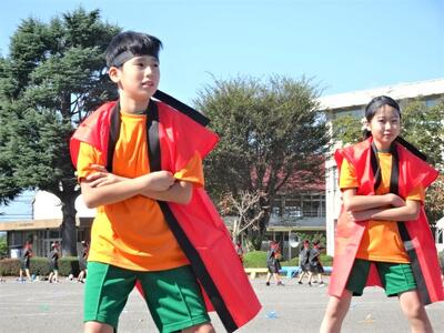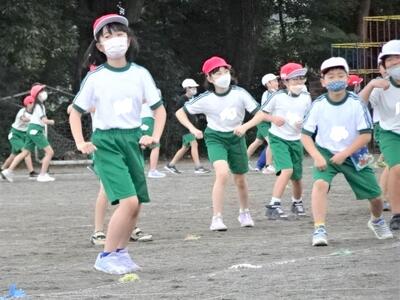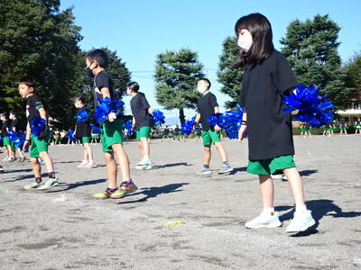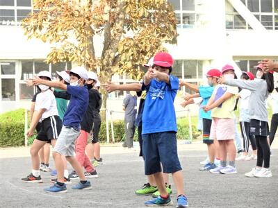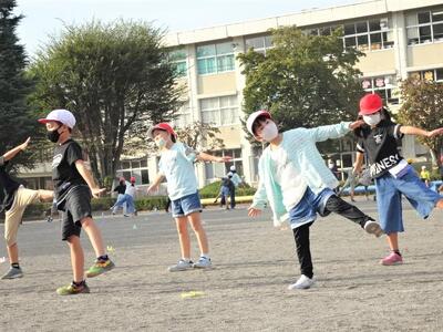 【4年生】1枚目の写真は、3・4年生の合同による運動会練習の様子です。初めての合同練習とは思えないほど、しっかりと踊っていました。写真は最後の決めのポーズです。お兄さんお姉さんとして、3年生に踊りの手本を見せる場面もありました。上級生としての意識が高まっています。