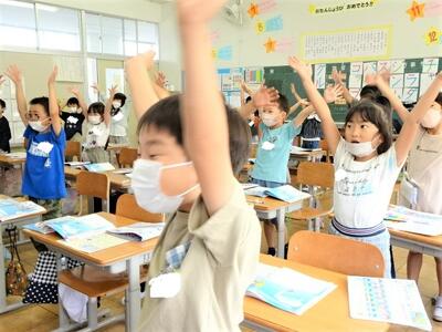 【1年生】1枚目と2枚目の写真は、国語の時間の一コマです。下の教科書に入って最初の教材「くじらぐも」の学習です。学校の授業中を舞台にした読み物で、クラスみんなでいう台詞などがあり、親しみやすい内容です。子どもたちは、さっそく物語の世界に入り込んでいるようでした。