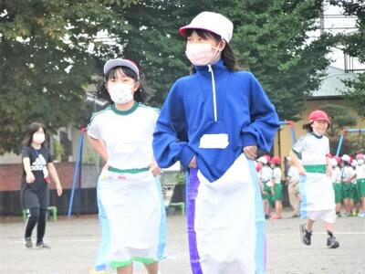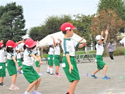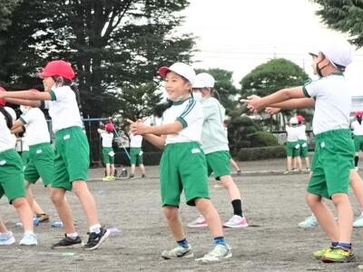 【2年生】1枚目の写真は、1・2年生合同の運動会練習の様子です。表現(ダンス)を練習しています。2年生に進級した今年は、お兄さんお姉さんとして、1年生の手本になれるようにと張り切っています。今日も、ダンスで最も難しいウェーブをしていく様子を、1年生への手本として見せていました。