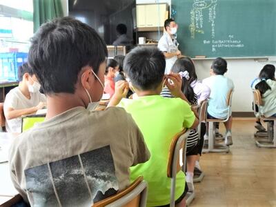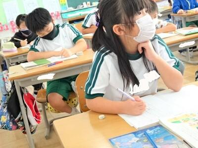 【3年生】1枚目の写真は、国語に時間の一コマです。「ちいちゃんのかげおくり」の学習が終わり、「修飾語を使って書こう」という学習に入りました。この学習で、文章の基本となる、主語・述語・修飾語がそろいます。しっかりと理解してほしい内容です。