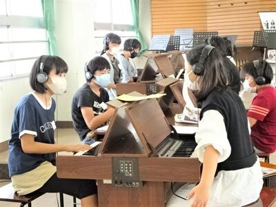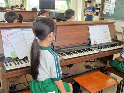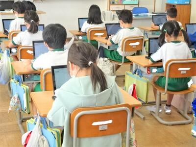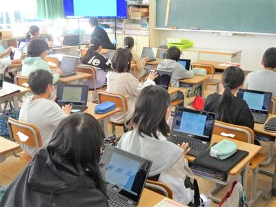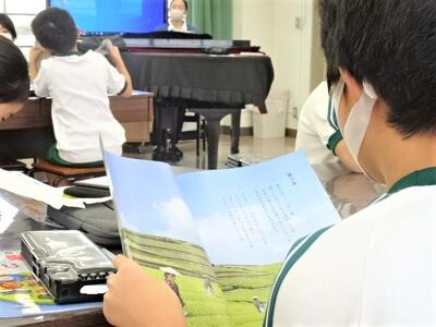 【5年生】1枚目の写真は、音楽の時間の写真です。「にっぽんのうた みんなのうた」の単元で、「赤とんぼ」などの曲を聴きながら感想をタブレットPCに書いています。懐かしい曲調の中に、日本らしさを味わっていました。